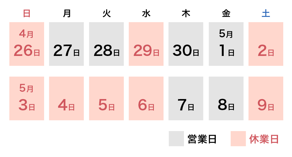 4月29日(水)・5月2日(土)から5月6日(水)までは